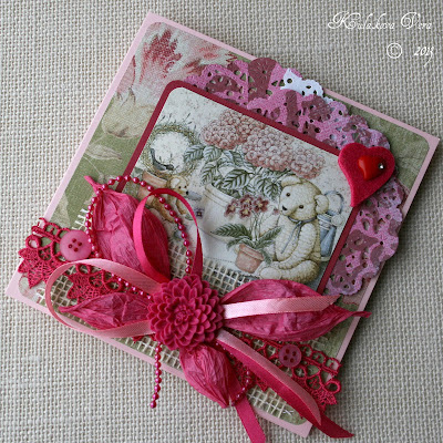 И у меня сегодня буйство красок, яркие летние цвета. Основной цвет декоративных элементов - это ярко розовый или может быть малиновый, фотоаппарат его немного исказил и я уже точно не помню как же он выглядит в натуре, надо прийти домой и посмотреть. У медведей сегодня праздник, я их вывела из темной, теплой берлоги на летнюю поляну))), где цветут яркие цветы и пархают красивые разноцветные бабочки.